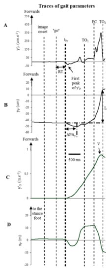 - Lepers, R.; Brenière, Y. The role of anticipatory postural adjustments and gravity in gait initiation. Exp. Brain Res. 1995, 107, 118–124. [Google Scholar] [CrossRef] [PubMed]