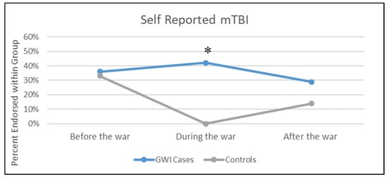 Percent of veterans with self-reported mTBI before, during, and after the war. * p < 0.005.