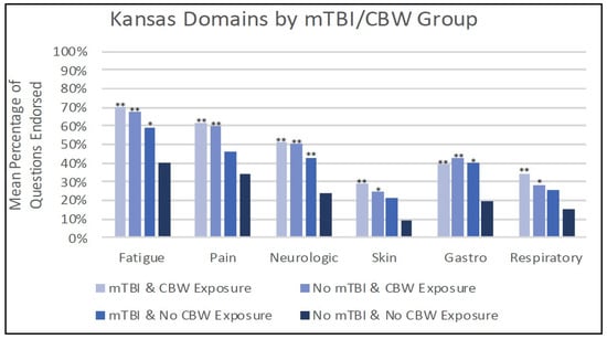 Kansas symptom domains by mTBI and CBW groups. * p < 0.05, ** p < 0.005 for comparison with reference group (no mTBI & no CBW exposure), mTBI = mild traumatic brain injury, CBW = chemical/biological weapons.