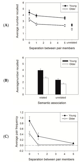 Second, we found that for both age groups, the association effect (better recall of associated than unrelated words) also depends on the separation of the pair members in the memory list, with better performance at short separation. This replicates the results by Glanzer [26], indicating that the encoding of the list is more effective when associated pairs co-occupy a capacity-limited working memory [27,29]. If older participants have reduced working memory capacity, one could expect that they will benefit less of associated pairs at separation-1; in both conditions, the pairs are unlikely to co-occupy working memory. Although the difference in total recall for separations 1 and 5 was numerically larger for young than for older participants, this difference was not statistically significant.