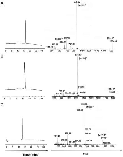 The purity of the final peptides was over 98%, as determined by HPLC analysis and electron spray ionization mass spectrometry (ESI-MS) (Figure 1).