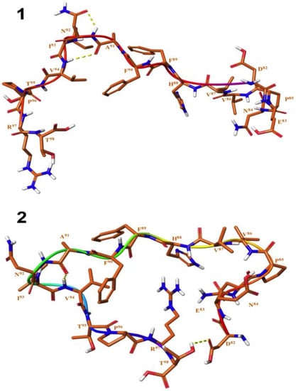 In regard to linear MBP82–98 (Ala91) (Scheme 2B), Figure 3 presents the low-energy conformers 1 and 2, which satisfy the NOE distance constraints, and Table 3 presents the corresponding peak assignment. The low-energy conformers of linear MBP82–98 (Ala91) are shown in Figure 3. NOESY spectrum for the linear analogue presented signals only between sequential NHs; thus, no crucial NOE was observed for the conformational arrangement of the peptide (Table 3). In addition, the linear peptide was energetically minimized and subjected to molecular dynamics simulations. Ten different families were produced, from which only two (representative conformer 1 and 2) satisfied the NOE distance constraints; Table 3 presents the corresponding peak assignment. More specifically, both conformers are characterized by a β-turn (CO A91-NH Val94) (Figure 3). For the case of conformer 1, an H-bond was observed between the N92 NH and the side chain CO of N92. Interestingly, an H-bond between the side chain of D82 and the OH of T98 provides a more closed conformation for conformer 2, which had the lowest energy compared to all of the other families.