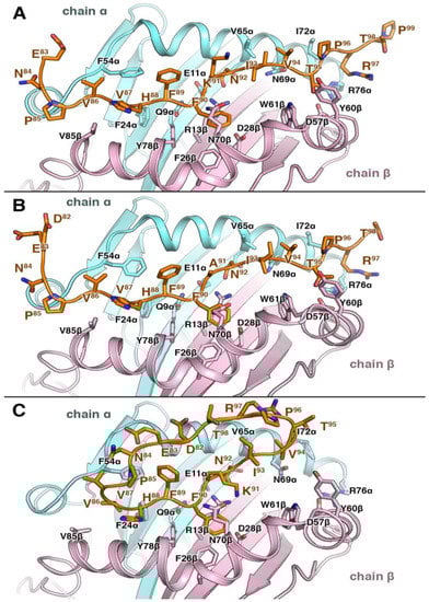 Binding of MBP83–99, linear MBP82–98 (A91), and cyclic MBP82–98 to HLA-DR2b (panels (A), (B), and (C), respectively). Peptides are shown in orange cartoon representation and sticks (side chains), while chains α and β are depicted in cyan and pink cartoon, respectively.