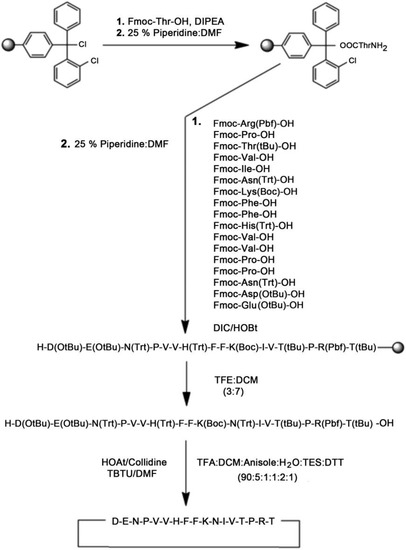 Schematic representation of the solid-phase peptide synthesis of a cyclic MBP82–98 peptide.