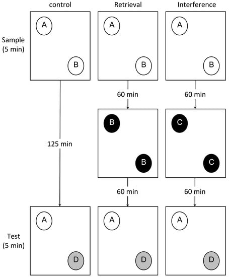 - Yamada, K.; Ueno, M.; Takano, E.; Ichitani, Y. Retrieval-induced forgetting in rats. Anim. Cogn. 2014, 17, 1407–1411. [Google Scholar] [CrossRef]