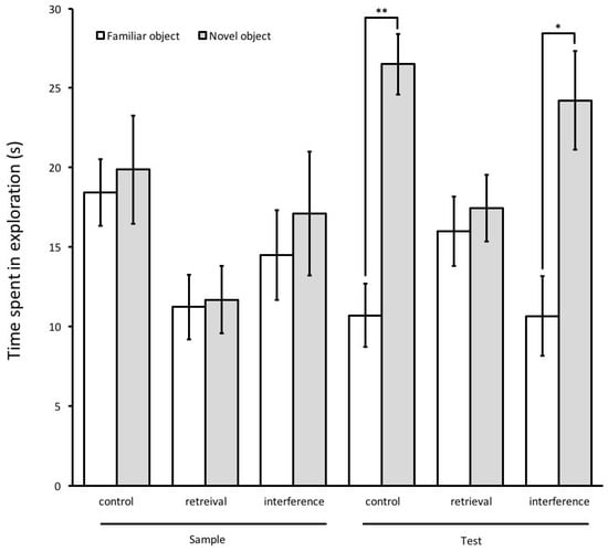 Time spent exploring objects (saline group). During the test phase, saline-treated rats in the retrieval group explored both objects similarly, while rats in control and interference groups explored the novel object more than the familiar one. The total amount of object exploration in seconds is shown as Mean ± SEM. * p < 0.05, ** p < 0.01.