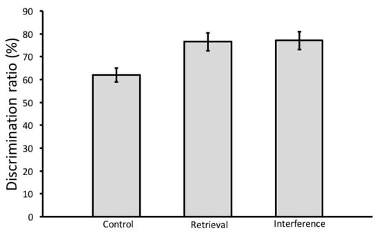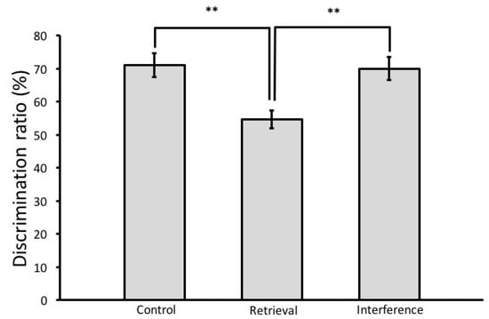 Discrimination ratio in the test phase (saline group). The discrimination ratio was calculated by dividing the total amount of exploration of the novel object by the total amount of object exploration. The retrieval group had significantly lower discrimination ratio than that of the control and the interference groups. Mean ± SEM is shown. ** p < 0.01.