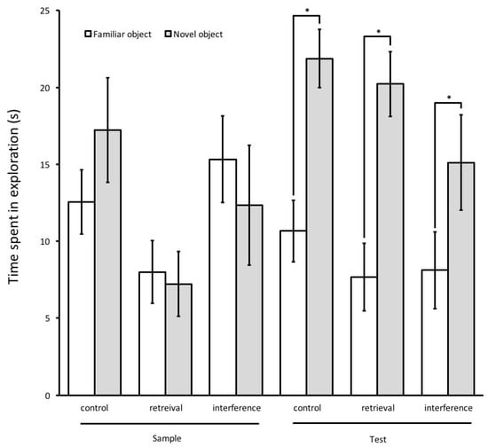 The insertion of an additional phase (the retrieval phase) between the sample and the test phases posed the possibility that rats might be less motivated to perform in the following test phase. This was ruled out by inserting an interference phase, which served as a control for the retrieval phase. Rats in the interference group were presented with two unrelated, novel objects before the test phase. In the test phase, no significant differences in the total exploration time were found between the retrieval and the interference groups.