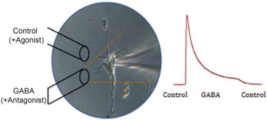 Application of solutions using capillaries. The application of solutions was controlled using solenoid valves; on the right of the photo, there is a representative trace of the current generated by the GABA application.