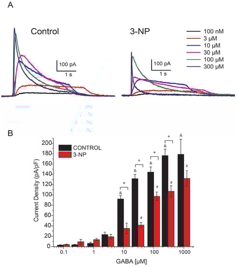 Dose-dependent response of GABA-activated current. (A) Representative traces of the activated current for 0.1, 3, 10, 30, 100, and 300 µM GABA from the MSNs of control and 3-NP mice. (B) Concentration dependent response to GABA is expressed as current density. The response to 10, 30, 100, and 300 µM of GABA was statistically different between control and 3-NP groups (F1, 94 = 6.39, p < 0.01, two way ANOVA), the GABA induced current amplitude increased significantly in both groups by rising the concentration of GABA from 10 µM for control group and from 30 µM for 3-NP groups (F8, 94 = 26.02, p < 0.05, two way ANOVA). Significant differences among GABA concentration are indicated with (&) for control group and with (#) for 3-NP groups and with a (*) for differences between 3-NP and control groups. Control group (black), 3-NP group (red). &, #, * p < 0.05.