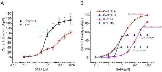 Analysis of the dose-response curve in the MSNs showed the presence of at least 2 populations of GABAergic receptors exhibiting different affinities for and efficacies in response to GABA. MSNs treated with 3-NP showed a change in EC50 of a population of receptors with low affinity, suggesting that mitochondrial inhibition modifies the expression and/or composition of the subunits of the GABAA receptor. There is experimental evidence of changes in the subunits of GABA receptors in a number of neuropathologies and in hypoxic events [].