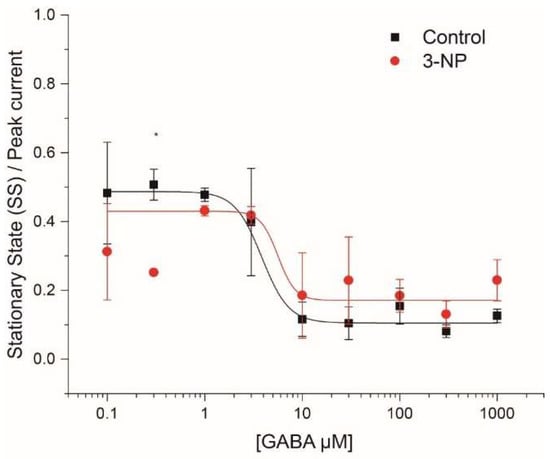 The equilibrium potential for GABA was the same between the 2 groups, as well as the recovery time of the response to 100 µM GABA. Interestingly, the current density was greater for neurons treated with 3-NP at the lowest GABA concentration (0.1 to 1 μM), indicating that GABA high affinity receptors increased in these group of cells, probably as compensatory response in the early stages of striatal neurodegeneration [].