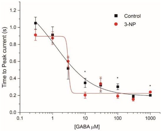 The time to peak was used as a measure of the activation time of IGABA. The values obtained at GABA concentrations of 10 µM, 100 µM and 1000 µM were significantly faster than those obtained with 0.1 µM, 0.3 µM, and 3 µM of GABA but we did not find significant differences between the control and the 3-NP groups except for 10 µM, 100 µM and 1000 µM (Figure 5).