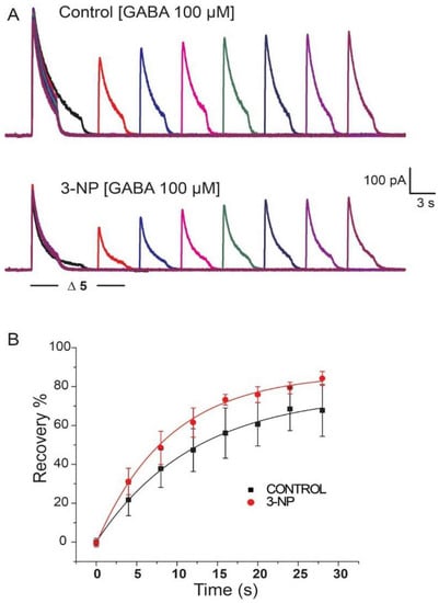 The recovery protocol described in the methodology section was used to evaluate both experimental groups. Figure 6A illustrates traces obtained for the control and 3-NP groups. The percentage of recovery of the current was plotted versus time and was fit to a first-order decaying exponential, yielding values similar for the control group and for the 3-NP group (Figure 6B).