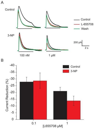 L-655708 effects on GABA induced current. (A) Representative traces of the current generated by GABA in the presence of 100 nM and 1 µM L-655708 in the MSNs of the control and 3-NP groups. (B) Plot of the GABA induced current reduction in the presence of two different concentrations of L-655708.