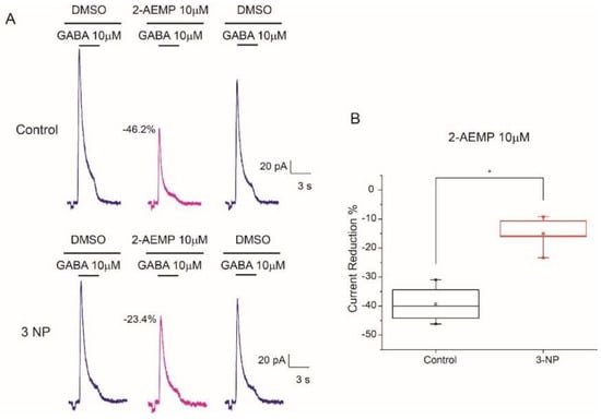 Pharmacological inhibition of GABA induced currents by Gaboxadol suggested the presence of GABAC receptors, since the Gaboxadol may act on GABAC and GABAA receptors we opted for the specific evaluation of GABAC function in striatal MSNs. To do that evaluation, we used the 2-Aminoethyl methylphosphonate trifluoroacetate salt (2-AEMP) a competitive GABAC antagonist. To see the effect of the 2-AEMP on high affinity GABA receptors we used a GABA concentration of 10 µM as reported by other studies []. 2-AEMP reduced IGABA peak current in neurons of both; control and 3-NP-treated mice (Figure 9A); however, the reduction in the 3-NP group was significantly smaller (−15.03 % ± 2.49) than in the control group (−39.29 % ± 2.49), suggesting that GABAC receptors are reduced as a result of mitochondrial inhibition (Figure 9B).