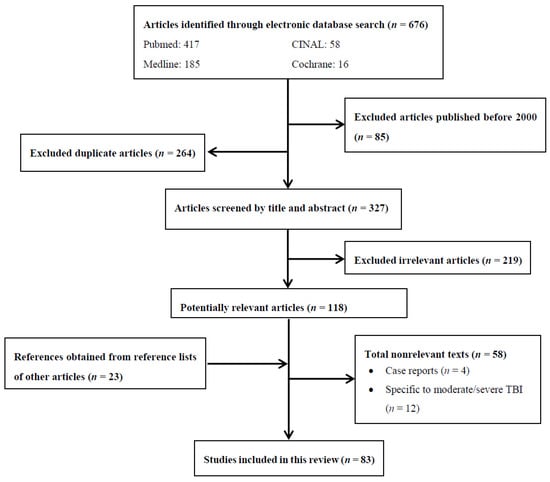 References for this narrative review were obtained using a search of online databases PUBMED, MEDLINE, CINAL, and COCHRANE (Figure 1). These online databases were used to search for papers published after the year 2000 using keywords: mild traumatic brain injury, mTBI, concussion, insomnia, sleep disturbance, and treatment. Boolean operator “AND” was used to connect search terms and narrow results. Truncations and MeSH headings were not used. Some references were not identified using the online databases, but were obtained through reference lists of other articles. Our inclusion criteria were studies that looked primarily at brain injury cases, specifically mild traumatic brain injury. Only papers printed in or translated into English were included. We excluded case reports as sources.