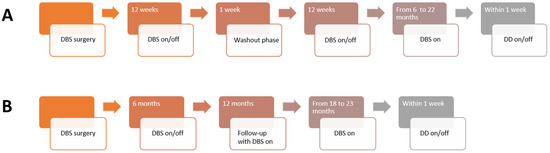 Timeline of the clinical studies and the successive delay discounting (DD) assessment. The sequence of deep brain simulation (DBS) on and off was pseudo-randomized. (A) The timeline of the NASA study and successive DD assessment. (B) The timeline of the DeBraSTRA study and successive DD assessment. (DBS, deep brain stimulation; DD, delay discounting).