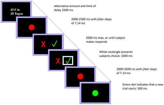 The screen displayed the alternative amount only and the time delay (white on black background) for 2500 ms. Then, a red dot was presented on the screen for a maximum of 2000 ms or until the subject pressed a button. Participants chose the cross or the tick to refuse or accept the alternative offer, respectively. After they responded, within 200 ms, the chosen symbol (cross or tick) was marked with a white rectangle for 1000 ms, and a new trial started with a red dot for 2000 to 2500 ms (m = 2250 ms with jitter steps of 7.14 ms) that turned green for a 500 ms, indicating the start of a new trial (see Figure 3). In case that responses exceeded 2000 ms, the instruction “Please respond faster!” was presented instead of the red dot.