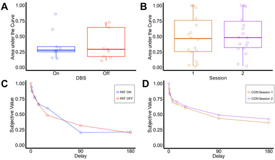 (A) Boxplots for AUC-values of NAc-DBS patients with SUD and (B) healthy controls; (C) depiction of subjective value as a proportion of objective value for NAc-DBS patients with SUD and (D) healthy controls. (CON, Healthy controls; DBS, Deep brain stimulation; Pat, Patients with SUD).
