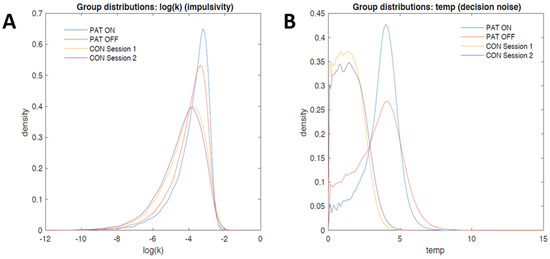(A) Group-level posterior distributions of log(k) for patients and controls; (B) Group-level distributions of decision noise (temp) for patients with SUD and controls. (CON, Healthy controls; Pat, Patients with SUD).