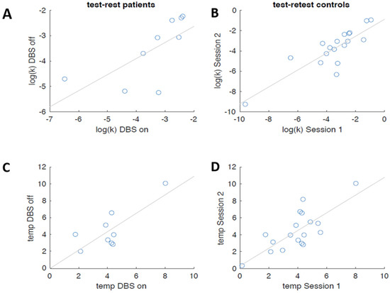 Retest stability (log(k) value) in (A) DBS patients with SUD and in (B) healthy controls. Decision noise (temp) in (C) DBS patients with SUD and in (D) healthy controls (DBS, deep brain stimulation; SUD, substance use disorder).