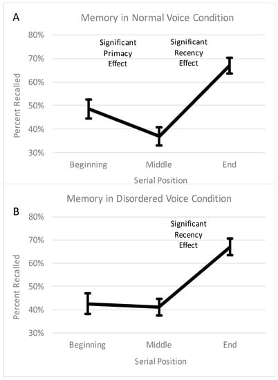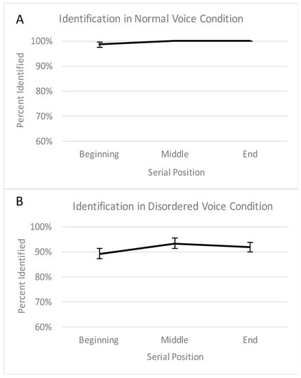 Unlike the previous studies, we analyzed serial-position effects, and interesting differences between a disordered and normal voice emerged. Specifically, we examined the u-shaped curve of recall, which is a robust and fundamental property of human memory [,]. The u-shaped curve reflects a primacy effect (i.e., an advantage for the beginning of the list relative to the middle) and a recency effect (i.e., an advantage for the end of the list relative to the middle). As would be expected, a u-shaped curve (with significant primacy and recency effects) was observed with the normal voice. However, the memory curve from the disordered voice was not u-shaped, as there was a significant recency effect but no significant primacy effect (i.e., no uptick on the left portion of the curve). This finding indicates that the standard memory advantage for the first words that are heard (relative to subsequent words) may not occur when the words are produced with an abnormal vocal quality. This finding cannot be attributed to lower word identification in the voice disordered condition, as the lack of a primacy effect was still observed when only accurately identified words were considered.