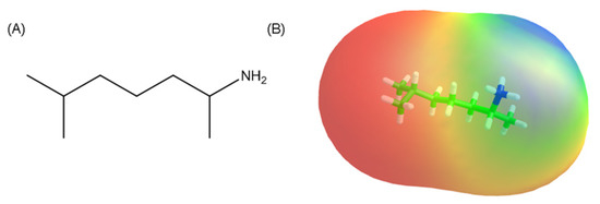 Chemical structure (A) and molecular lipophilicity potential (MLP) surface (B) of octodrine molecule (hydrophobic surfaces are depicted in red and polar surfaces are in blue) [21].