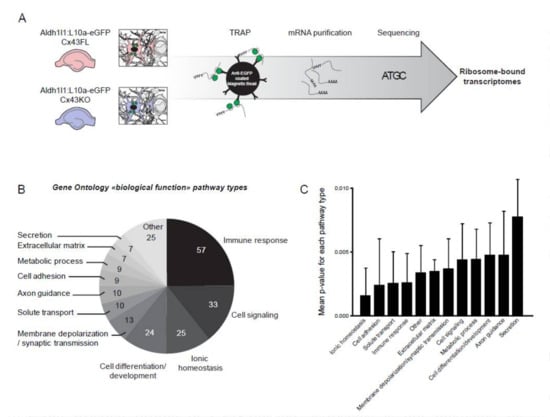 Comparative analysis of the polysomal astroglial transcriptome in Cx43KO and Cx43FL hippocampus; (A) Flowchart of the transcriptome procedure. Astrocyte polysomes were immunoprecipitated by TRAP from 6 weeks-old Aldh1l1:L10a-eGFP Cx43FL and Aldh1l1:L10a-eGFP Cx43KO hippocampi. Purified mRNAs were analyzed by RNASeq; (B,C) Gene Ontology “biological processes” analysis of differentially-expressed pathways between Cx43FL and Cx43KO astrocytes. (B) Circular diagram of pathway types, with the number of pathways for each type. (C) Detailed p-values of the Mann Whitney test for a change in expression between Cx43FL and Cx43KO astrocytes for each type of pathway.