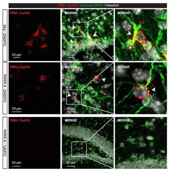 Detection of Cxcl10 mRNAs in Cx43KO hippocampal astrocytes; Confocal images of FISH detection of Cxcl10 mRNAs (red dots) on P25 and 6 weeks-old Cx43KO and 6 weeks-old Cx43FL hippocampal sections. Astrocyte processes were immunolabeled for the GFAP (green). Nuclei were stained with Hoechst (white). Right panels are larger magnifications of squared areas in the merge image (middle panel). Arrowheads indicate Cxcl10-expressing astrocytes.