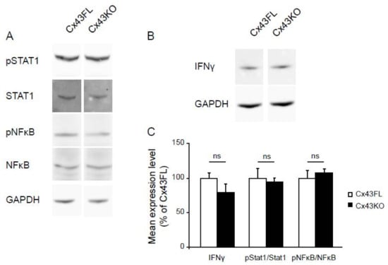 Dissected hippocampi from 6 weeks-old animals were homogenized in Phosphate buffered saline (PBS) containing 2% SDS and EDTA-free Complete Protease Inhibitor (Roche, Basel, Switzerland), sonicated three times at 20 Hz (Vibra cell VCX130) and centrifuged 20 min at 10,000× g at 4 °C. Supernatants were boiled in Laemmli loading buffer. Protein content was measured using the Pierce 660 nm protein assay reagent (Thermo Fisher, Waltham, MA, USA). Equal amounts of proteins were separated by denaturing electrophoresis in 4–12% NuPAGE gradient gels (Thermo Fisher) and electrotransfered to nitrocellulose membranes. Membranes were analyzed as previously described []. HRP activity was visualized by ECL using Western Lightning plus enhanced chemoluminescence system (Perkin Elmer, Waltham, MA, USA). Chemoluminescence imaging was performed on a LAS4000 (Fujifilm, Minato-ku, Tokyo, Japan). GAPDH expression was used as a loading reference for γIFN expression. Total amount of STAT-1 and NFκB were used as a reference to determine proportion of phosphorylated proteins, pSTAT-1 and pNFκB respectively. All experiments were done in triplicates (n = 3). Cx43FL and Cx43KO expression levels were compared using the Mann-Whitney two-tailed test; ns stands for p > 0.05. Mean values are indicated ± the Standard Deviation (SD).