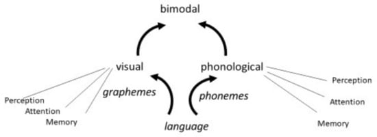 Dyslexia is a specific deficit that renders an individual unable to acquire fluent reading skills in the absence of other cognitive deficits. Although dyslexia can be individuated in many different ways, it has only three discernable sources: a visual deficit that affects the perception of letters, a phonological deficit that affects the perception of speech sounds, and a bimodal (phono-visual) deficit that disturbs the association of letters with speech sounds [] (Figure 1). Each of these three deficits is related to a different neural substrate and has a different genetic origin, suggesting that they can be present independently of each other in individuals with dyslexia []. Each deficit can in turn be expressed in different ways as it can possibly impact different cognitive dimensions such as perception, memory, and attention. These dimensions are interrelated [] but each of them might be more or less severely affected in individuals with dyslexia depending on genetic and environmental factors.