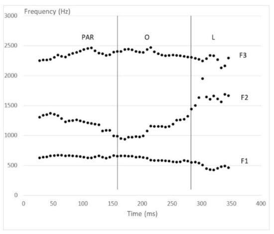 Formant frequencies (Praat© [], version 6.0.37) in the word /paRol/ produced by a French speaker. The vertical lines correspond to the perceptual limits between the /Rol/ segment and the initial (PAR) and final (L) parts of the word. F1, F2, F3 correspond to formants one, two and three, respectively.