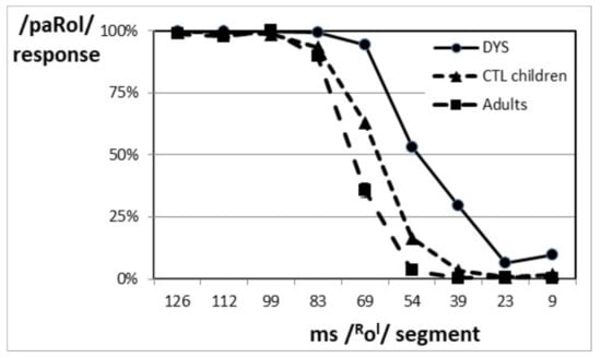 There was a significant difference in the location of the paRol/paRl boundary between the CTL children and adults (F(1,76) = 35.3, p < 0.001, η2 = 0.317). The adults’ boundary was located at a longer duration than the children’s one (72 ms, SD = 3.2; 65 ms, SD = 5.4; respectively; see Figure 3), showing a decrease with age. As the DYS children were older than the CTL children (whole samples, Table 1), the fact that their boundary was located at a shorter duration than that of the CTL children can hence not be readily explained by the difference in chronological age between the two groups. However, a nonlinear effect of age cannot be entirely ruled out.