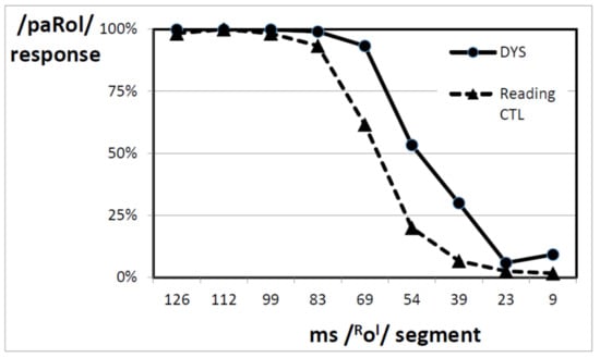 Figure 3 shows that the paRol/paRl boundary was located at a longer /Rol/ duration (65 ms location; SD = 5.1 ms) for the CTL children than for the DYS children (50 ms location; SD = 5.4 ms). The difference in boundary location between the two groups of children was significant (F(1,69) = 116; p < 0.001; η2 = 0.627). This difference in boundary location was fairly small (about 15 ms) but it was highly reliable. When the boundary location was used to reclassify the children as either DYS or CTL with Discriminant Analysis, there was about 90% correct reclassification (cross-validated classification with one-drop-out).