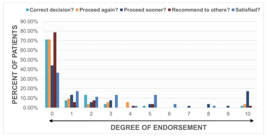 Satisfaction was rated high by the majority with 65% of patients scoring a 0, 1 or 2 evidenced by a median score (range) of 1 (0–8). Patients endorsed having made the correct decision by undergoing DBS, with a score of 0 (0–10), would choose to have DBS again, with a score of 0 (0–10), and would recommend DBS to others, with a score of 0 (0–10). The majority of patients indicated that they would have preferred surgery at an earlier time with 63.5% of patients scoring a 0, 1 or 2, leading to a median score of 1 (0–10). (Figure 1).