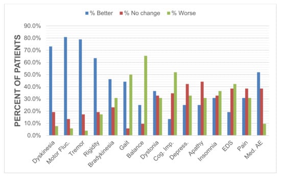 There was a weak but significant correlation between current satisfaction and patient-rated severity in motor (rs = 0.36, p = 0.01) and non-motor symptoms (rs = 0.33, p = 0.02) (Table S3). The majority of patients reported improvements in dyskinesias, motor fluctuations, tremor, rigidity and side effects of medication, whereas gait, balance and non-motor symptoms were mostly reported as being worse. (Figure 2, Table S4). Those who reported worsening in apathy (rs = 0.4, p = 0.03) and insomnia (rs = 0.43, p = 0.01) were less satisfied (Table S5).
