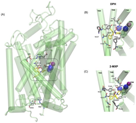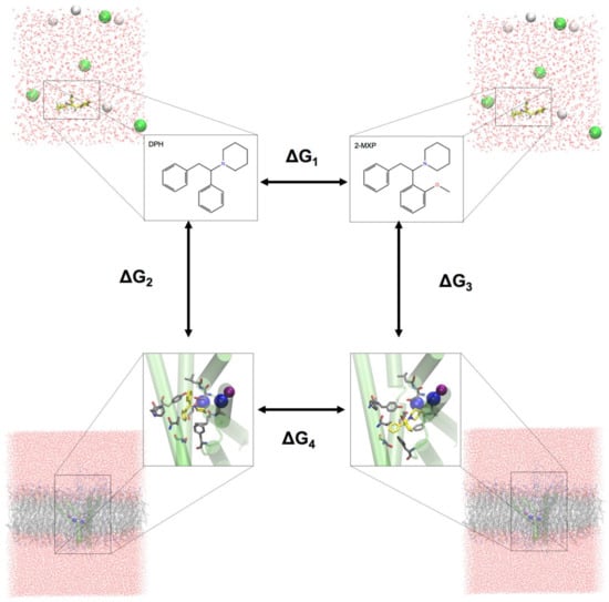 Interestingly, the values for ∆∆G reveal ranked predictive binding free energies with respect to DPH as follows 4-MXP (−0.75 kcal/mol) > 3-MXP (−0.65 kcal/mol) > DPH (0 kcal/mol) > 2-Cl-DPH (0.35 kcal/mol) > 2-MXP (3.63 kcal/mol).