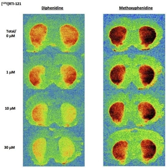 125I]RTI-121 in NaPB pH 7.4 with increasing concentrations of the drugs tested (0–30 µM) for 60 min at room temperature; non-specific binding was assessed in the presence of 200 µM nomifensine. Slides were opposed to Kodak BioMax MR films for 4 days; autoradiograms were analysed using MCID™, Version 7.0, Imaging Research Inc. (St. Catharines, ON, Canada),