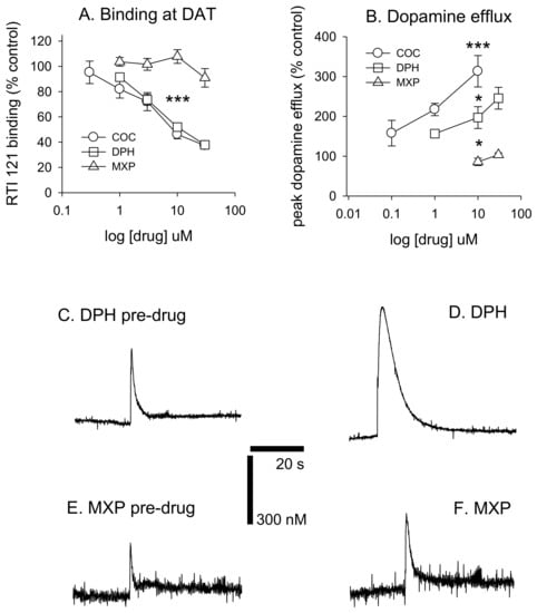 64]. This observation is supported by the present in vitro data where DPH acts as a DAT inhibitor but weaker than cocaine, which can cause a 4-fold increase in DA efflux, as previously observed under identical conditions [