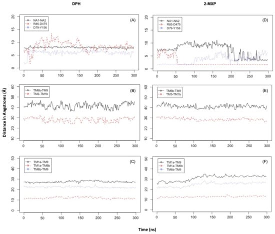 In DPH we see a disruption of the extracellular network with the ionic interaction between Arg 85 and Asp 475 for DPH (a feature not seen with the other compounds) (