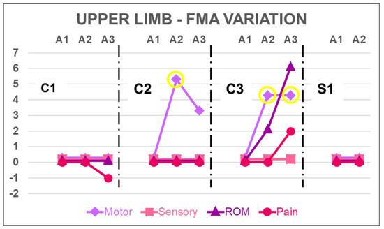 Although patient C1 had reported difficulties in performing ADLs with the affected upper limb, she obtained the highest score for the motor function in the pre-evaluation. In this case, FMA was not sensitive enough for this patient. To our knowledge, no studies have provided a minimal clinically important score for the FMA sensory function and pain absence subsections. Therefore, it still lacking a parameter to proceed with an integrated analysis of the different subsections of FMA [55]. Although FMA is recommended as a validated tool for primary outcomes in intervention trials [56,57], the lack of methods for individualized and integrated analysis of its subsections reduces its effectiveness.
