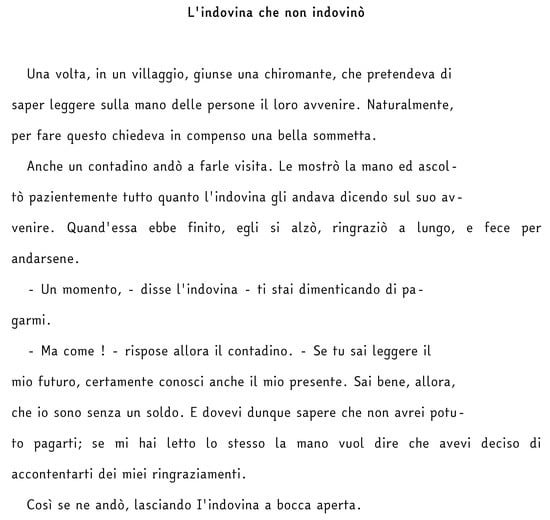 All reading tests (text, lists of words and non-words) were used in their original version (MT and DDE-2) and in a modified version specially prepared for this study, in which the original Times New Roman font was replaced with the EasyReading™ font. In order not to create further elements of diversity, the number of syllables per line, the graphic layout and the character size were kept the same among all tests. The only aspects that differed were those specific to the EasyReading™ font, such as line spacing, letter spacing and the lack of serifs (Figure 1 and Figure 2).