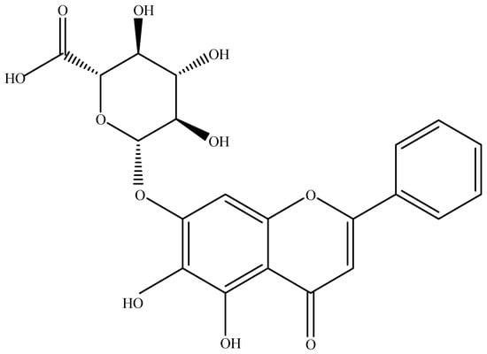 Baicalin (C21H18O11; 5,6,7-trihydroxyflavone 7-O-beta-d-glucuronide or baicalein 7-O-β-d-glucuronic acid or 7-d-glucuronic acid-5,6-dihydroxyflavone) (Figure 1) is one of the most important flavonoid components in the roots of Scutellaria baicalensis Georgi. The concentration of baicalin in the roots of S. baicalensis ranged from 8.1% to 15.6% [,,,]. The root of this plant has been traditionally used for the treatment of numerous diseases in East Asia. Synonyms of S. baicalensis are S. grandiflora Adams, S. lanceolaria Miq., and S. macrantha. Baicalin is also the major constituent in other Scutellaria species, namely S. lateriflora, S. galericulata, and S. rivularia, as well as in Oroxylum indicum (Bignoniaceae). Different species of Scutellaria are mainly distributed in Asian countries, such as China, Russia, Mongolia, Japan, and Korea [].