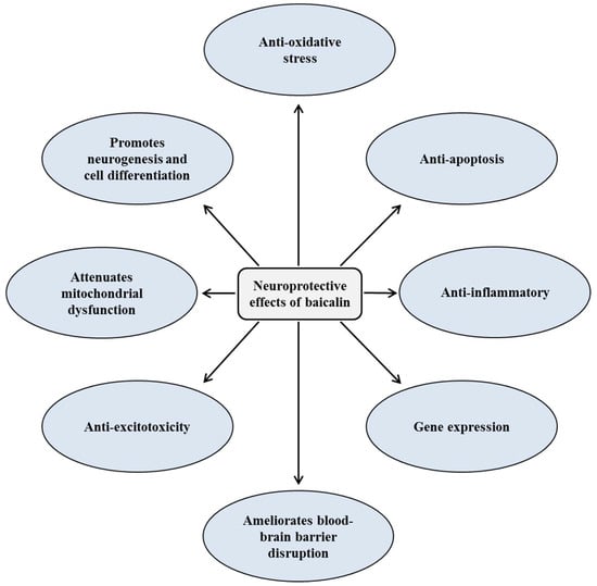 The brain and nervous system-related diseases affect over two billion people worldwide and many of the most harmful brain diseases are neurodegenerative. Chronic neurodegenerative diseases, including Alzheimer’s (AD), Parkinson’s (PD), and Huntington’s diseases represent a large unmet medical need in the world. These diseases refer to those conditions in which neuronal cells undergo progressive degeneration and eventual death associated with aging []. Accumulating evidence suggests that excitotoxicity, oxidative stress, mitochondrial dysfunction, inflammatory response, protein misfolding, and neuronal apoptosis have been associated with neurodegeneration [,]. The most common symptoms of neurodegenerative diseases are anxiety, apathy, depression, motor dysfunction, and memory impairment []. Numerous studies have shown that baicalin efficiently prevents various neurodegenerative diseases, such as AD, PD, and cerebral ischemia, by suppressing oxidative stress, inhibiting excitotoxicity, and promoting neurogenesis, reducing apoptosis, and inhibiting the production of inflammatory cytokines [,,].