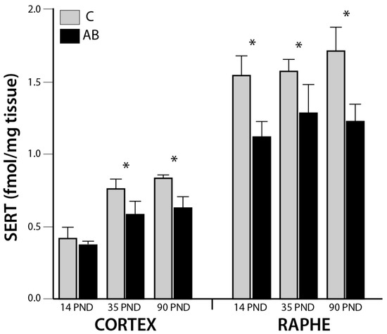 Histological Analysis: In control subjects (as well as experimental) DAT and SERT densities increased over time in all measured areas in agreement with other developmental studies [36,37,38,39]. Table 2 shows that SERT and DAT typically reached adult levels by 35 days of age in most brain areas. In some brain stem regions (substantia nigra: DAT; raphe area: SERT), however, adult levels were reached by 14 PND (F3,59 = 0.94, p > 0.05 and F2,51 = 2.96, p > 0.05 respectively).