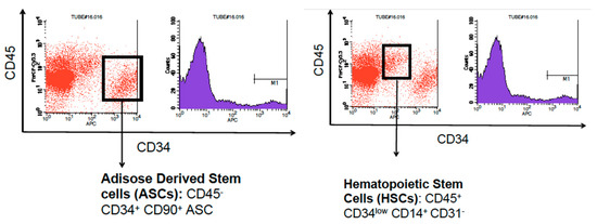 Flowcytometry analysis of stromal vascular fraction shows the presence of adipose derived stem cells characterized by CD45- , CD34+ , CD90+ cell surface markers and hematopoietic stem cells characterized by CD45+, CD34low, CD14+, and CD31- cell surface markers. .