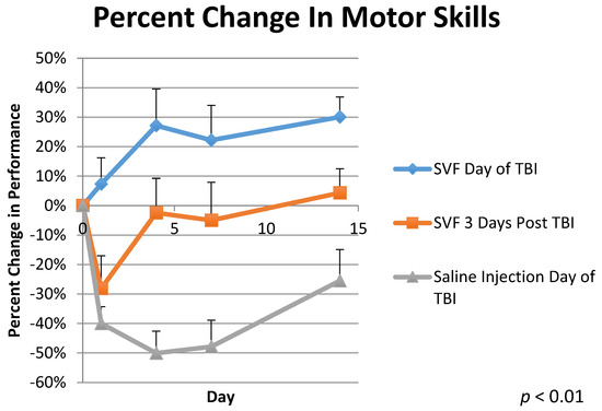 Percent Change in Motor Skills shows a comparison between three groups. Group 1 was treated with stromal vascular fraction the day of traumatic brain injury administration. Group 2 was treated with SVF 3 days post TBI, and Group 3 (control) was treated with Lactated Ringer’s solution the day of TBI. Behavioral testing was observed for 14 days post TBI. N = 6 for each treatment. p < 0.01.