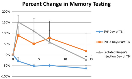 Percent Change in Memory shows a comparison between three groups: Group 1, which was treated with SVF the day of TBI and Group 3, which was treated with Lactated Ringer’s solution the day of TBI. The test was continued for 14 days. N = 6 per treatment. p < 0.01. Data from Group 2, rats treated with SVF 72 h post injury, is also included but not statistically significant.