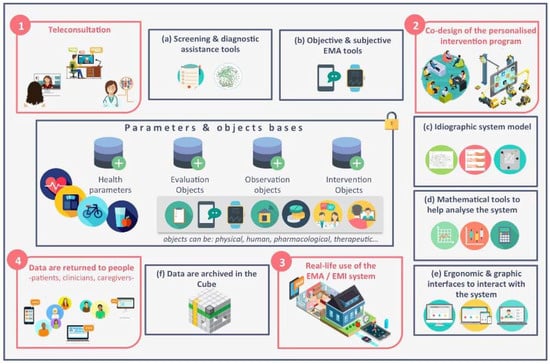 The development of i-mental health systems integrating the functionalities that have been presented is a complex process, which is beginning to be the subject of new work [,,]. An integrated device will necessarily have to rely on a team of health professionals trained in the use of connected devices, able to propose a set of functionalities adapted to each user according to his needs and situation, to analyse the data collected and to propose interventions. These professionals will need to be able to rely on a platform that allows them to generate an integrated suite of mobile applications in a totally flexible way to the patient/therapist’s choice by integrating pre-existing or custom-developed functionalities that can be reprogrammed according to the patient’s evolution. This suite should be capable of: (a) collecting health data in programmable ways; (b) using data from diverse eHealth/wellness applications; (c) aggregating standardized sensor flows and commercial applications; (d) providing therapeutic and prevention support and accompaniment tools; (e) dialogue with environmental servers (smart cities, smart homes, etc.); and (f) proposing user interfaces allowing data sharing for co-analysis and co-decision purposes between users, healthcare professionals, relatives, other stakeholders, and so on.